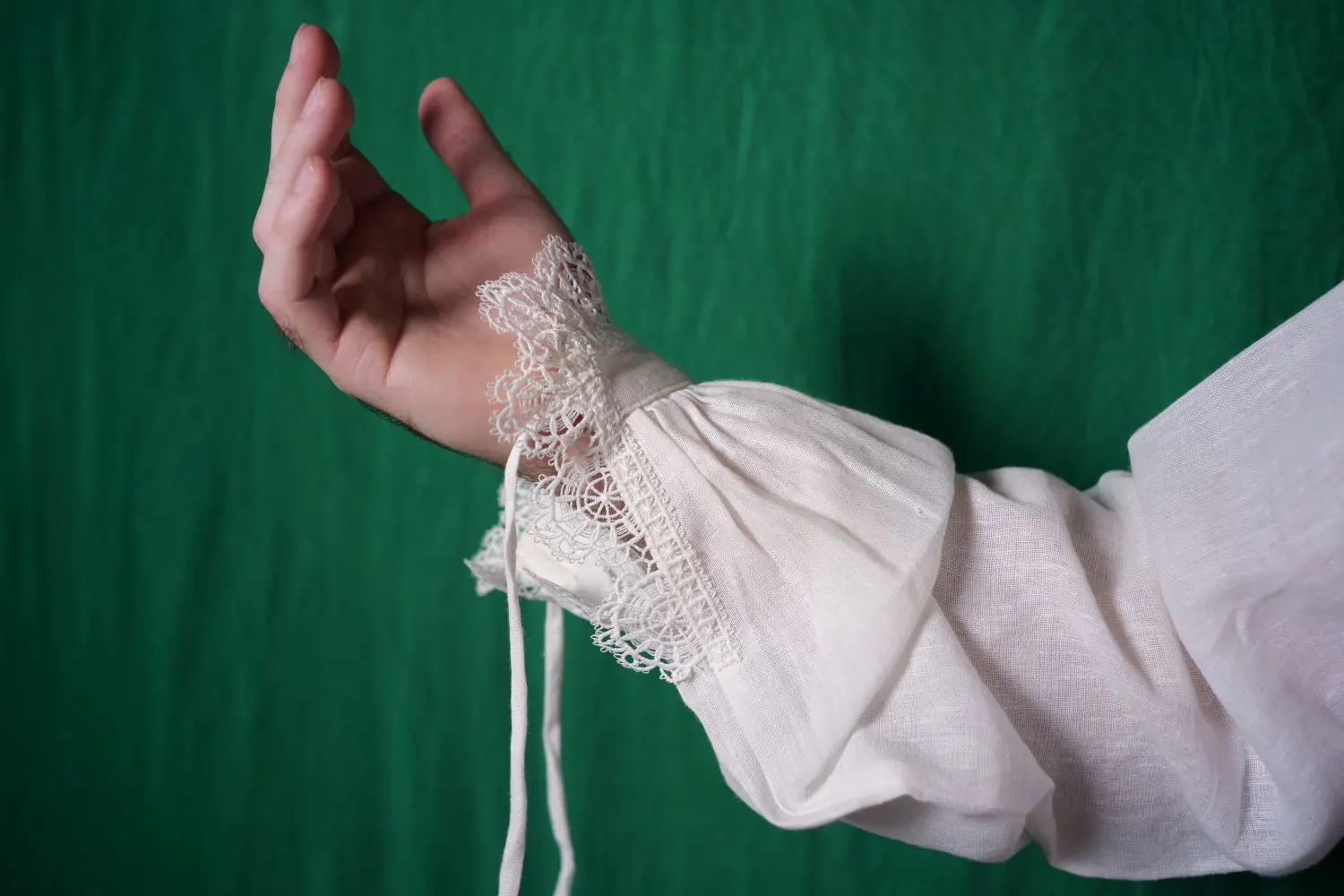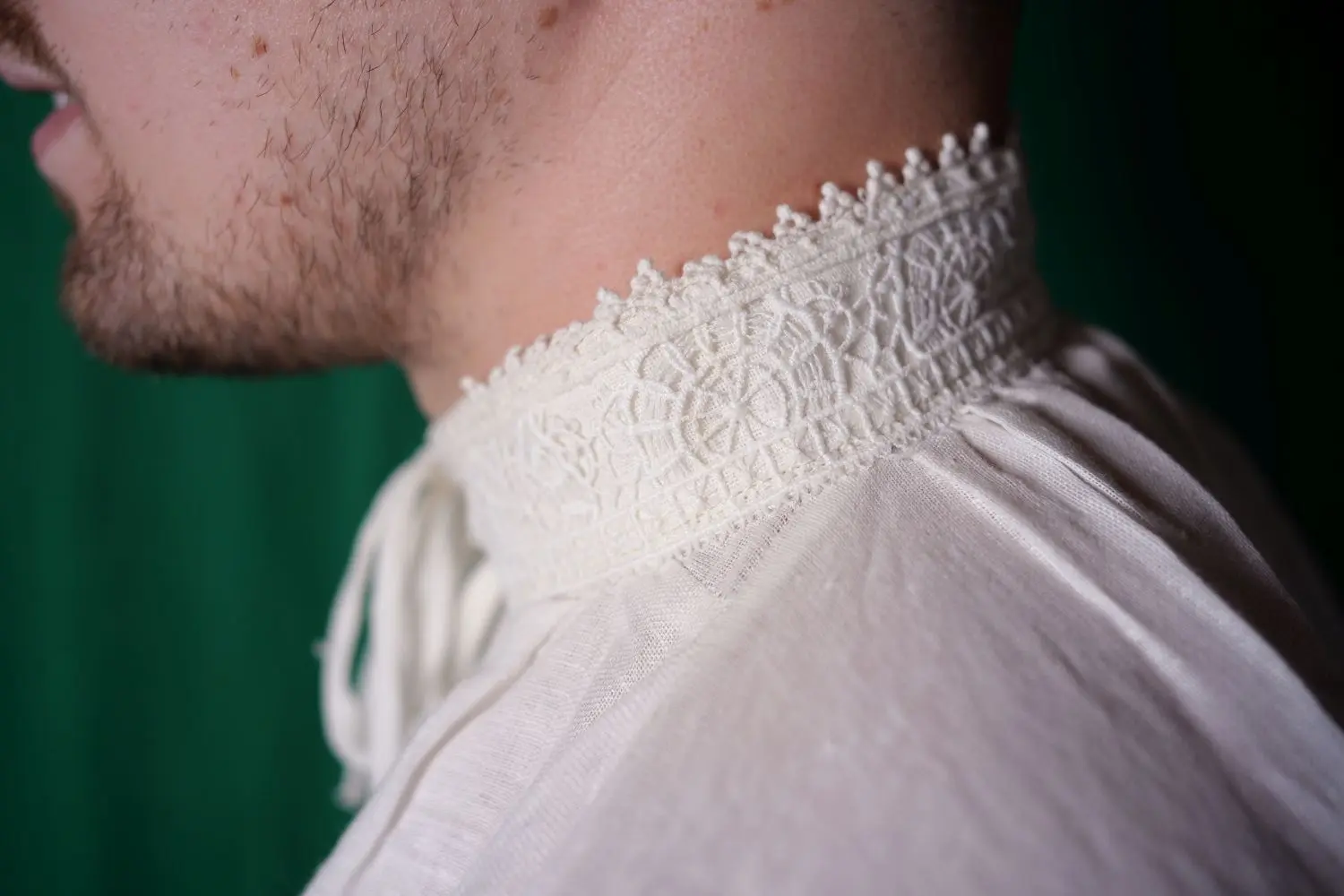 Ez a finoman kidolgozott, 16. századi ihletésű ing az egyszerű elegancia megtestesítője. A könnyű, természetes anyagból készült darabot a nyaknál futó, aprólékos csipkedíszítés teszi különlegessé. Szabása kényelmes, bővülő ujja és szellős kialakítása lehetővé teszi a szabad mozgást, így akár hétköznapi viseletként, akár történelmi rendezvényeken, vásárokon vagy színpadi előadásokon is megállja a helyét.